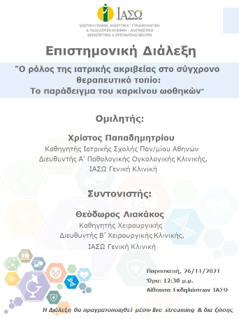 Σας ενημερώνουμε ότι την Παρασκευή, 26 Νοεμβρίου 2021 και ώρα 12:30 μ.μ. πραγματοποιήθηκε η Επιστημονική Διάλεξη του ΙΑΣΩ Γενικής Κλινικής μέσω Live Streaming και δια ζώσης στην Αίθουσα Εκδηλώσεων του ΙΑΣΩ, με θέμα " Ο ρόλος της ιατρικής ακριβείας στo σύγχρονo θεραπευτικό τοπίο: Το παράδειγμα του καρκίνου ωοθηκών". Ομιλητής ήταν ο κ. Χρίστος Παπαδημητρίου,Καθηγητής Ιατρικής Σχολής Παν/μίου Αθηνών, Διευθυντής Α’ Παθολογικής Ογκολογικής Κλινικής, ΙΑΣΩ Γενική Κλινική. Συντονιστής ήταν ο κ. Θεόδωρος Λιακάκος, Καθηγητής Χειρουργικής, Διευθυντής Β’ Χειρουργικής Κλινικής, ΙΑΣΩ Γενική Κλινική.