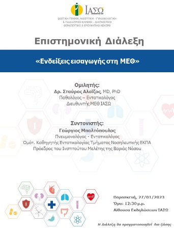 Σας ενημερώνουμε ότι την Παρασκευή, 27 Ιανουαρίου 2023 και ώρα 12:30 μ.μ. θα πραγματοποιηθεί Επιστημονική Διάλεξη του ΙΑΣΩ Γενική Κλινική με φυσική παρουσία στην Αίθουσα Εκδηλώσεων του ΙΑΣΩ, με θέμα «Ενδείξεις εισαγωγής στη ΜΕΘ». Ομιλητής θα είναι ο Δρ. Σταύρος Αλοΐζος, MD, PhD, Παθολόγος – Εντατικολόγος, Διευθυντής ΜΕΘ ΙΑΣΩ. Συντονιστής θα είναι ο κ. Γεώργιος Μπαλτόπουλος, Πνευμονολόγος – Εντατικολόγος, Ομότ. Καθηγητής Εντατικολογίας Τμήματος Νοσηλευτικής ΕΚΠΑ, Πρόεδρος του Ινστιτούτου Μελέτης της Βαριάς Νόσου.
