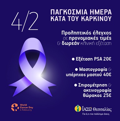 Με αφορμή την Παγκόσμια Ημέρα Κατά του Καρκίνου (World Cancer Day) στις 4 Φεβρουαρίου, το ΙΑΣΩ Θεσσαλίας προσφέρει προληπτικές εξετάσεις σε προνομιακές τιμές, στο πλαίσιο του προγράμματος Εταιρικής Κοινωνικής Ευθύνης της Κλινικής, αποσκοπώντας στην ενημέρωση και ευαισθητοποίηση του κοινού για την έγκαιρη πρόληψη των συχνότερων μορφών καρκίνου.