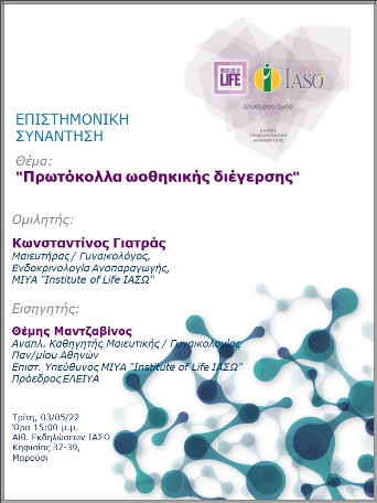 Σας ενημερώνουμε ότι την Τρίτη 03 Μαΐου 2022 και ώρα 15:00 μ.μ. θα πραγματοποιηθεί μέσω Live Streaming και με φυσική παρουσία, η Επιστημονική Συνάντηση της Μονάδας IVF "Institute of Life ΙΑΣΩ" με θέμα "Πρωτόκολλα ωοθηκικής διέγερσης" και ομιλητή τον κ. Κωνσταντίνο Γιατρά, Μαιευτήρα / Γυναικολόγο, Ενδοκρινολογία Αναπαραγωγής, ΜΙΥΑ "Institute of Life ΙΑΣΩ". Εισηγητής θα είναι ο κ. Θέμης Μαντζαβίνος, Αναπλ. Καθηγητής Μαιευτικής / Γυναικολογίας Παν/μίου Αθηνών, Επιστ. Υπεύθυνος ΜΙΥΑ "Institute of Life ΙΑΣΩ", Πρόεδρος ΕΛΕΙΥΑ.