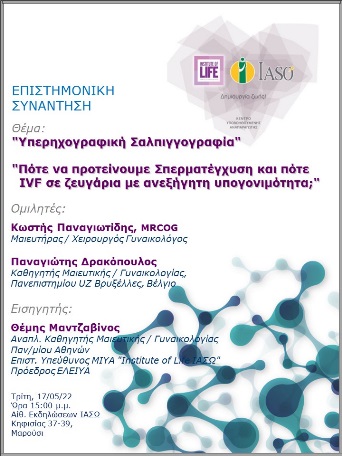 Σας ενημερώνουμε ότι την Τρίτη 17 Μαΐου 2022 και ώρα 15:00 μ.μ., θα πραγματοποιηθεί μέσω Live Streaming και με φυσική παρουσία, η Επιστημονική Συνάντηση της Μονάδας IVF "Institute of Life ΙΑΣΩ" με θέμα 1ο "Υπερηχογραφική Σαλπιγγογραφία"