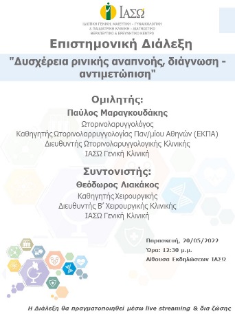 Σας ενημερώνουμε ότι την Παρασκευή 20 Μαΐου 2022 και ώρα 12:30 μ.μ. θα πραγματοποιηθεί η Επιστημονική Διάλεξη του ΙΑΣΩ μέσω Live Streaming και δια ζώσης στην Αίθουσα Εκδηλώσεων του ΙΑΣΩ, με θέμα "Δυσχέρεια ρινικής αναπνοής, διάγνωση - αντιμετώπιση".