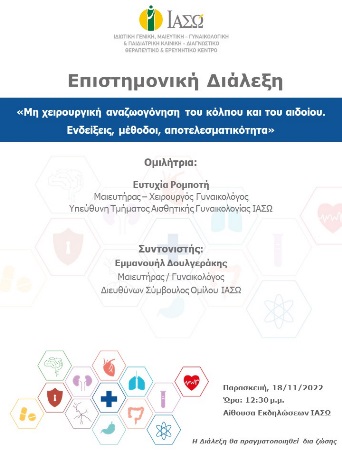 Σας ενημερώνουμε ότι την Παρασκευή, 18 Νοεμβρίου 2022 και ώρα 12:30 μ.μ. θα πραγματοποιηθεί Επιστημονική Διάλεξη του ΙΑΣΩ με φυσική παρουσία στην Αίθουσα Εκδηλώσεων του ΙΑΣΩ, με θέμα «Μη χειρουργική αναζωογόνηση του κόλπου και του αιδοίου. Ενδείξεις, μέθοδοι, αποτελεσματικότητα». Ομιλήτρια θα είναι η κα. Ευτυχία Ρομποτή, Μαιευτήρας – Χειρουργός Γυναικολόγος, Υπεύθυνη Τμήματος Αισθητικής Γυναικολογίας ΙΑΣΩ. Συντονιστής θα είναι ο κ. Εμμανουήλ Δουλγεράκης, Μαιευτήρας / Γυναικολόγος, Διευθύνων Σύμβουλος Ομίλου ΙΑΣΩ.
