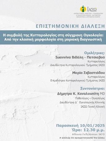 Σας ενημερώνουμε ότι την Παρασκευή 10 Ιανουαρίου 2025 και ώρα 12:30 μ.μ. θα πραγματοποιηθεί η Επιστημονική Διάλεξη του ΙΑΣΩ με θέμα «Η συμβολή της Κυτταρολογίας στη σύγχρονη Ογκολογία: Από την κλασική μορφολογία στη μοριακή διαγνωστική». Ομιλήτριες θα είναι η κα. Ιωαννίνα Βιδάλη – Πατσιαβού, Κυτταρολόγος, Διευθύντρια Κυτταρολογικού Τμήματος ΙΑΣΩ και η κα. Μαρία Σεβαστιάδου, Κυτταρολόγος, Επιμελήτρια Κυτταρολογικού Τμήματος ΙΑΣΩ. Συντονίστρια θα είναι η κα. Δήμητρα Κ. Καναλουπίτη MD, Παθολόγος – Ογκολόγος, Διευθύντρια Δ΄ Ογκολογικής Κλινικής, ΙΑΣΩ Γενική Κλινική. Τη διάλεξη θα έχετε τη δυνατότητα να την παρακολουθήσετε με φυσική παρουσία στην Αίθουσα Εκδηλώσεων του ΙΑΣΩ ή μέσω της ιστοσελίδας του Ομίλου σε μεταγενέστερο χρόνο.
