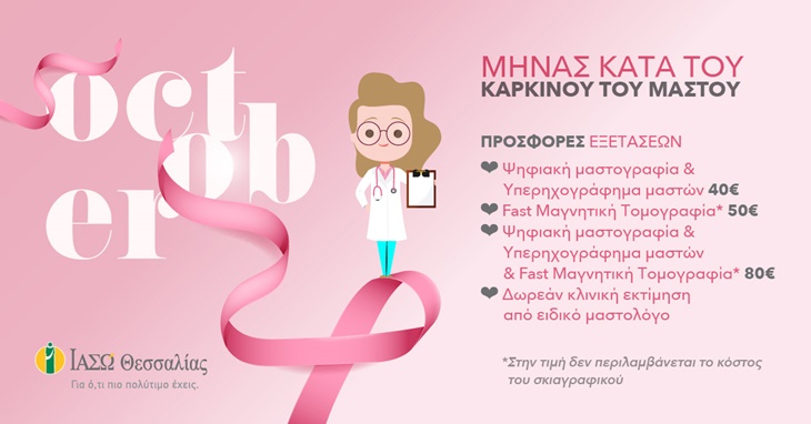 Ο μήνας Οκτώβριος είναι αφιερωμένος στη μάχη κατά του καρκίνου του μαστού. Το ΙΑΣΩ Θεσσαλίας, θέλοντας να τονίσει τη σημασία του προληπτικού ελέγχου και να δώσει τη δυνατότητα σε όσο το δυνατόν περισσότερες γυναίκες να κάνουν το ετήσιο check up του μαστού τους, προσφέρει ειδικά πακέτα εξετάσεων: