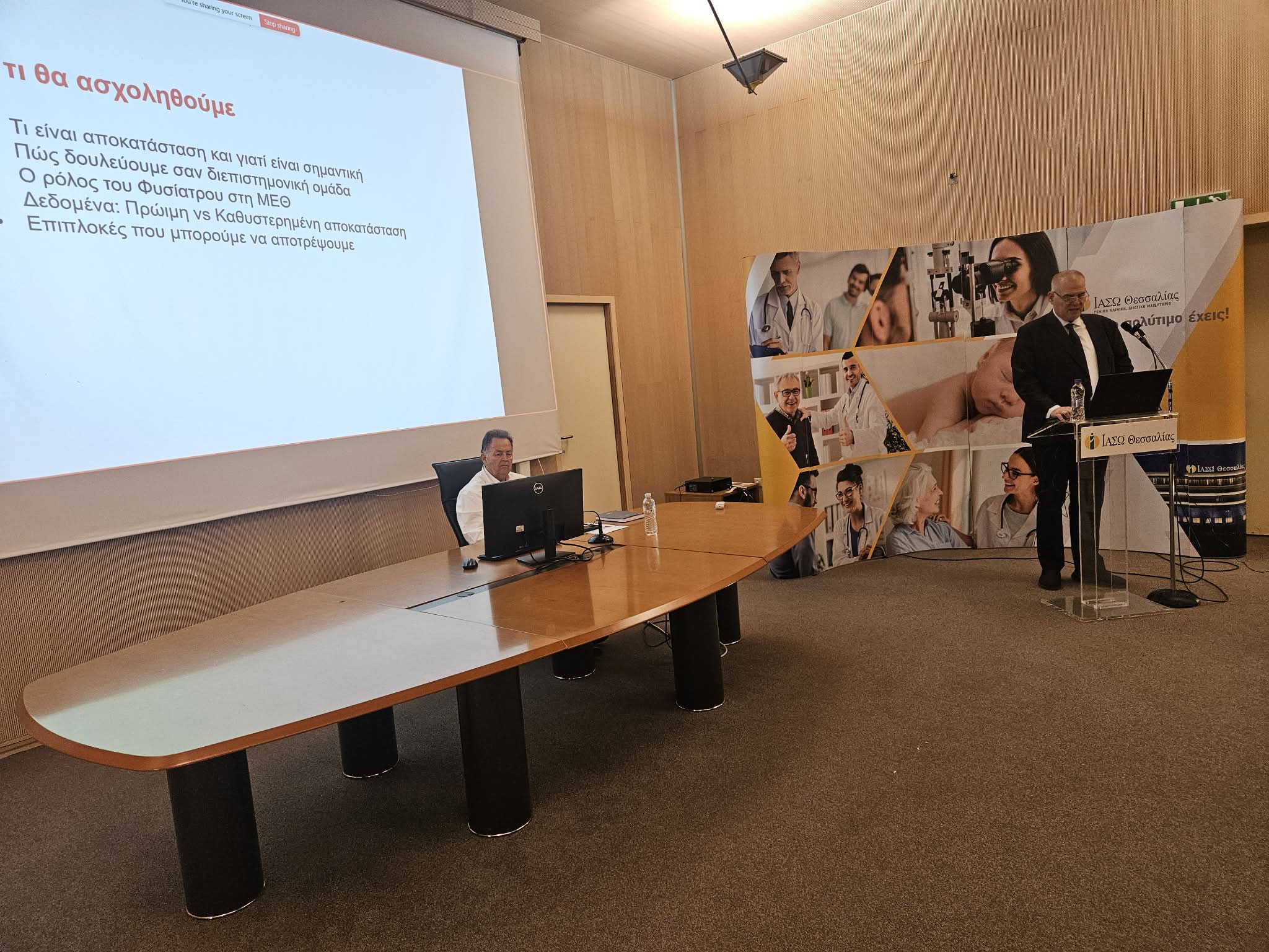Στο επίκεντρο της διάλεξης αναδείχθηκε η αποκατάσταση ως διαδικασία που ξεκινά από την πρώτη ημέρα νοσηλείας στη ΜΕΘ, με στόχο τη διατήρηση της λειτουργικότητας, την πρόληψη επιπλοκών και την επανένταξη του ασθενή στην καθημερινή ζωή. Παρουσιάστηκαν τεκμηριωμένα δεδομένα που καταδεικνύουν τα πλεονεκτήματα της πρώιμης αποκατάστασης, τόσο σε επίπεδο λειτουργικής έκβασης όσο και στη μείωση επιπλοκών και διάρκειας νοσηλείας, με έμφαση στην πρόληψη καταστάσεων όπως η επίκτητη μυϊκή αδυναμία της ΜΕΘ και το σύνδρομο post - ICU. Ιδιαίτερη αναφορά έγινε στον ρόλο της διεπιστημονικής ομάδας και στη συμβολή του Φυσιάτρου στον συντονισμό και την εξατομίκευση του προγράμματος αποκατάστασης, κατά την οξεία φάση και μετά την έξοδο από τη ΜΕΘ.